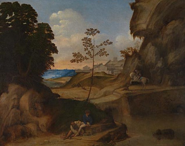 The little St George on a prancing horse in the middle is apparently a restorer's invention of 1934. This is a very appropriate painting for an epidemiologist such as myself because in the foreground is Saint Roch protector against plagues, having his bandages attended to by his companion Gothardus. And in the cave in the right background is the barely visible Anthony Abbot, protector against epidemics. However, the plague got Giorgione in 1510.