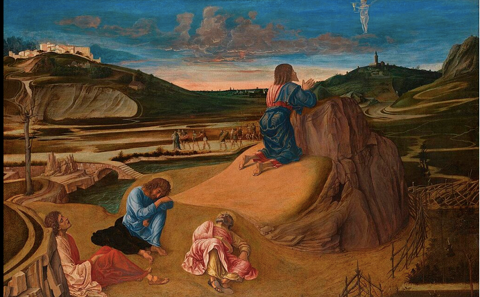 I pushed further, looking for a Renaissance sunset and Ms Solnit came up with Bellini's "Agony in the Garden” (1465), with Jesus in the center asking if God could let him off the hook