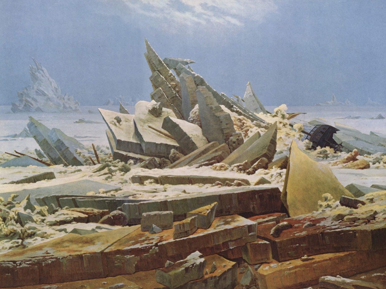 He's getting an oceanic feeling, a kind of low-intensity psychedelic vision. This was new, I guess, in 1797 when he wrote it. In the sunset he sees "the motion and spirit that rolls through all things" -- that is, he sees a version of God, in God's new Romantic incarnation as Nature. He sees the sunset as uniting "all thinking things" (us) with "all objects of all thought" (nature, the world). This is the Romantic Sublime in action as opposed to the plain old beautiful. He gives us a hit of the awe and possibly terror that was supposed to define the sublime. (Actually in the Romantic iconography terror was more associated with jagged peaks, raging torrents, plunging abysses and so forth. Or see Caspar David Friedrich's marvellous "The Sea of Ice," below).