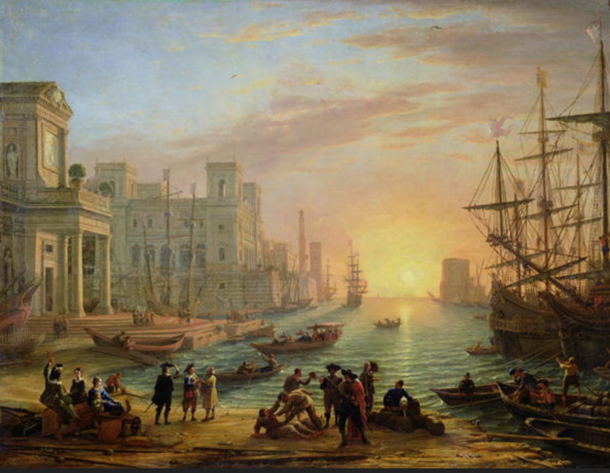 It's Claude Lorraine's "Seaport at Sunset" (1639). Claude did quite a few of these; he seems to have fallen in love with ports at sunset.