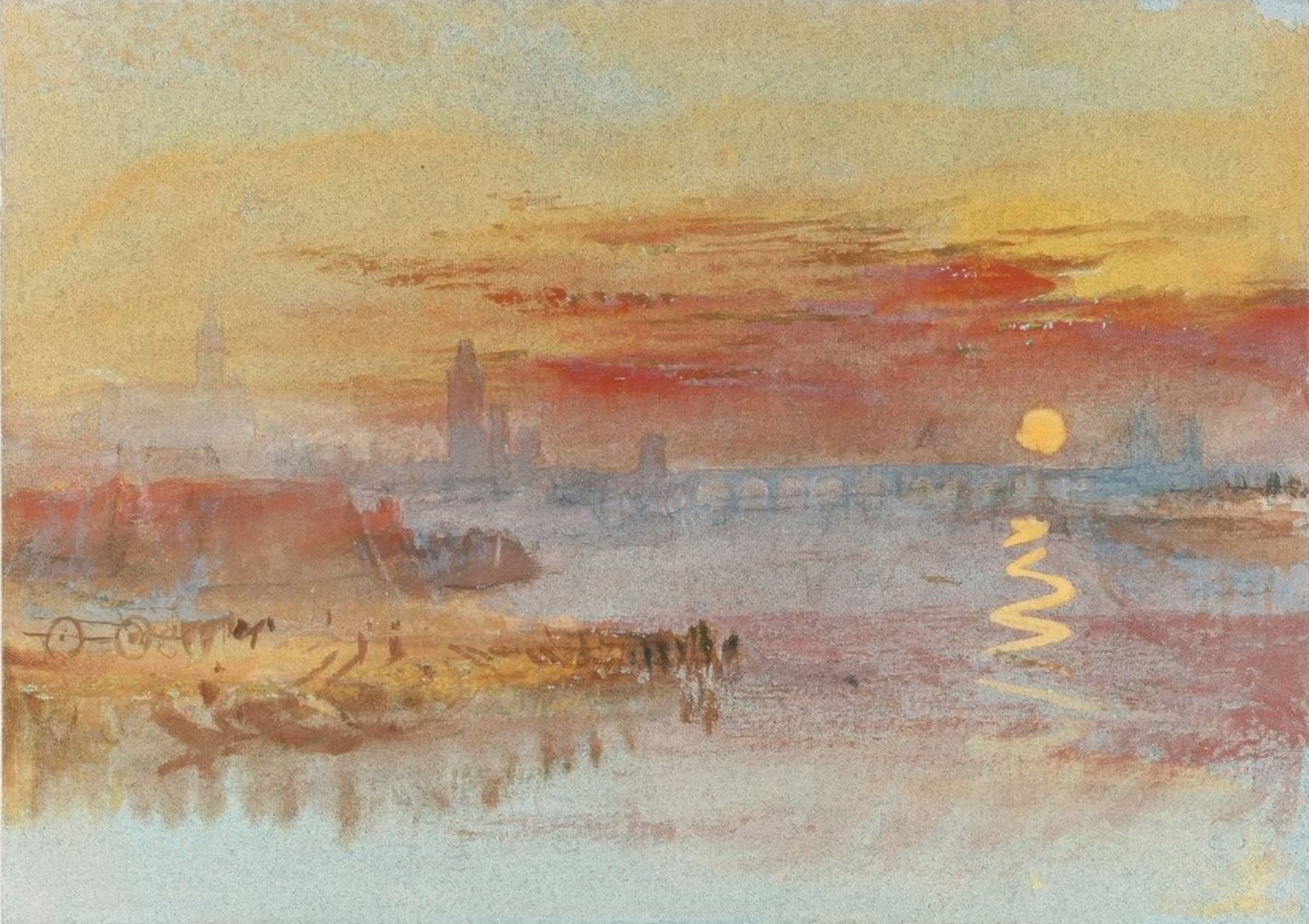 Turner, the great English Romantic painter, did a whole bunch of sunsets too. This is "The Lake, Petworth: Sunset, Fighting Bucks"(1829) and below it "The Scarlet Sunset " (1830).